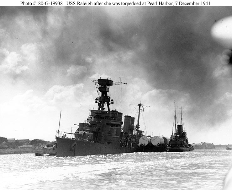 Apparently the enemy planes had expected to find the Lexington and Enterprise near our berth and fired at the Utah and Raleigh, as the carriers were fortunately not in. When it appeared that the ship might not capsize or sink (the water was 45′ deep at our berth) Ensign J.H. COYLE, USN, of the Raleigh, was told to see if he could find an oil bottom that was free from water and to raise steam in either #3 or 34 fireroom, as water was getting in to the after engine room and #3 and #4 firerooms, and if they were flooded there would be little hope of keeping the ship afloat. This was done and the pumps started.
